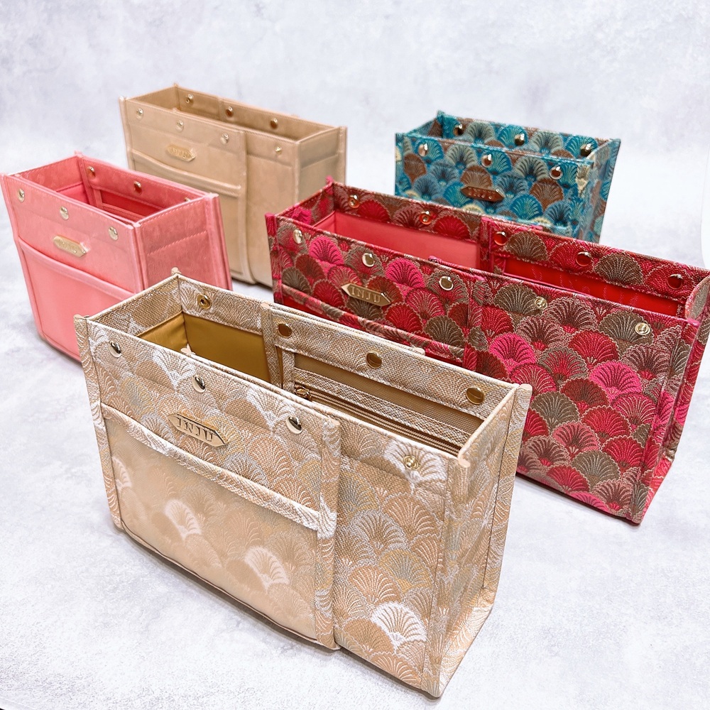 開発するからには、漠然とした役割ではなく、バッグの中の劇的な変化をもたらすための基準を設けました。横幅の調節方法は誰もが簡単にできるデザインにすること、ストレスフリーな出し入れと仕切りの役割を叶えるための完全自立型、視認性の高いメッシュ素材のポケット、ペンや扇子などの細長いアイテムの専用ポケットバッグの中が見やすくなる明るいカラーと軽量化、そして、バッグとカラーコーデができるオシャレ感ある大人品質に仕上げること。これらの項目をすべて取り入れ、ワイド調節機能付バッグインバッグは誕生いたしました。